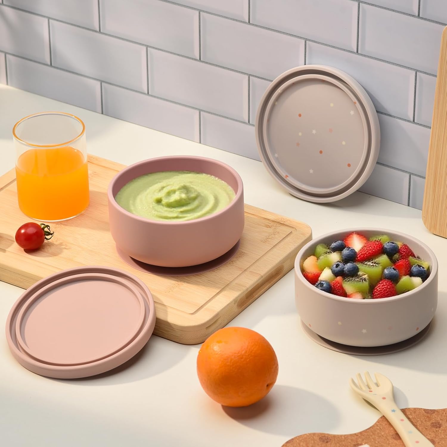 2-Pack Baby Bowls with Suction - Silicone Bowl with Lid, Non-Slip Suction Bowls for Baby, Feeding Bowl for Baby Led Weaning - Dishwasher Safe, Toddler Bowls for High Chair & Travel (Pink+Grey)